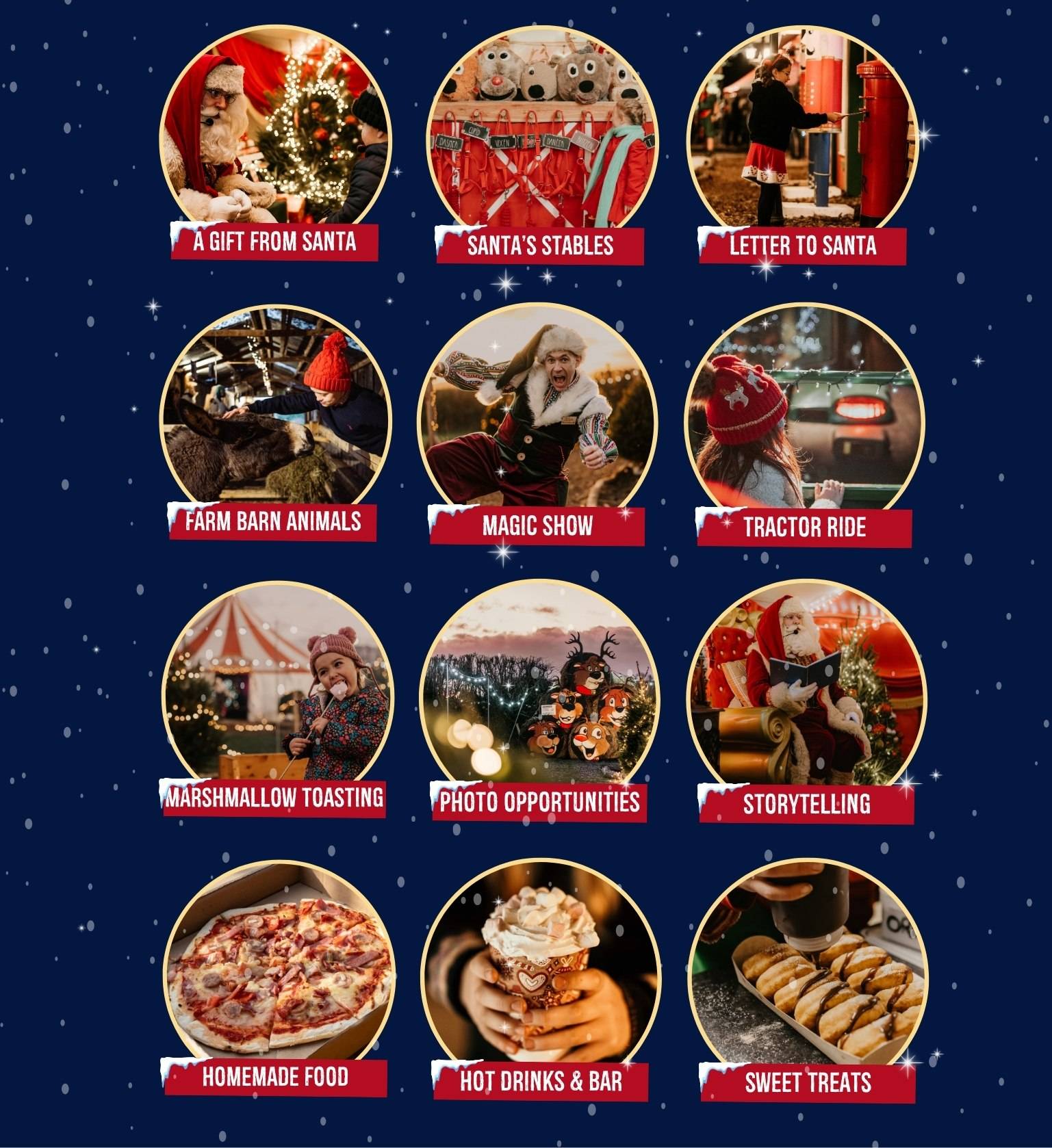 Your festive journey begins at Santa’s Stables, where little ones can make their own reindeer food and toast marshmallows by the fire. Next, enjoy Elf Martin’s dazzling magic show before strolling through Frosty’s Farmyard to meet our friendly animals on the way to see Santa himself!